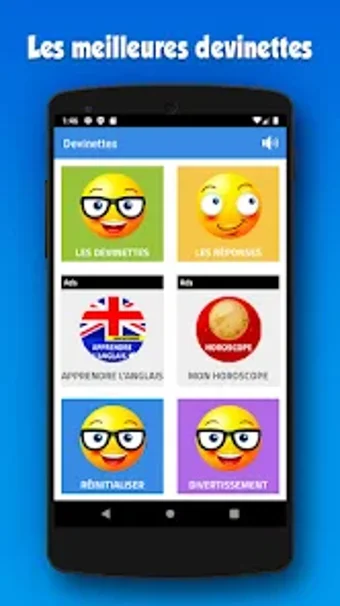 Devinette avec réponse é um jogo de palavras divertido disponível para Android, que desafia os usuários com mais de 150 enigmas e charadas. A proposta é simples: adivinhar a resposta correta a partir de um conjunto de letras, oferecendo uma experiência envolvente que estimula o raciocínio lógico. A cada acerto, o jogador acumula pontos, tornando o jogo ainda mais competitivo e cativante. Além disso, novos desafios são adicionados regularmente, garantindo que o entretenimento nunca acabe.